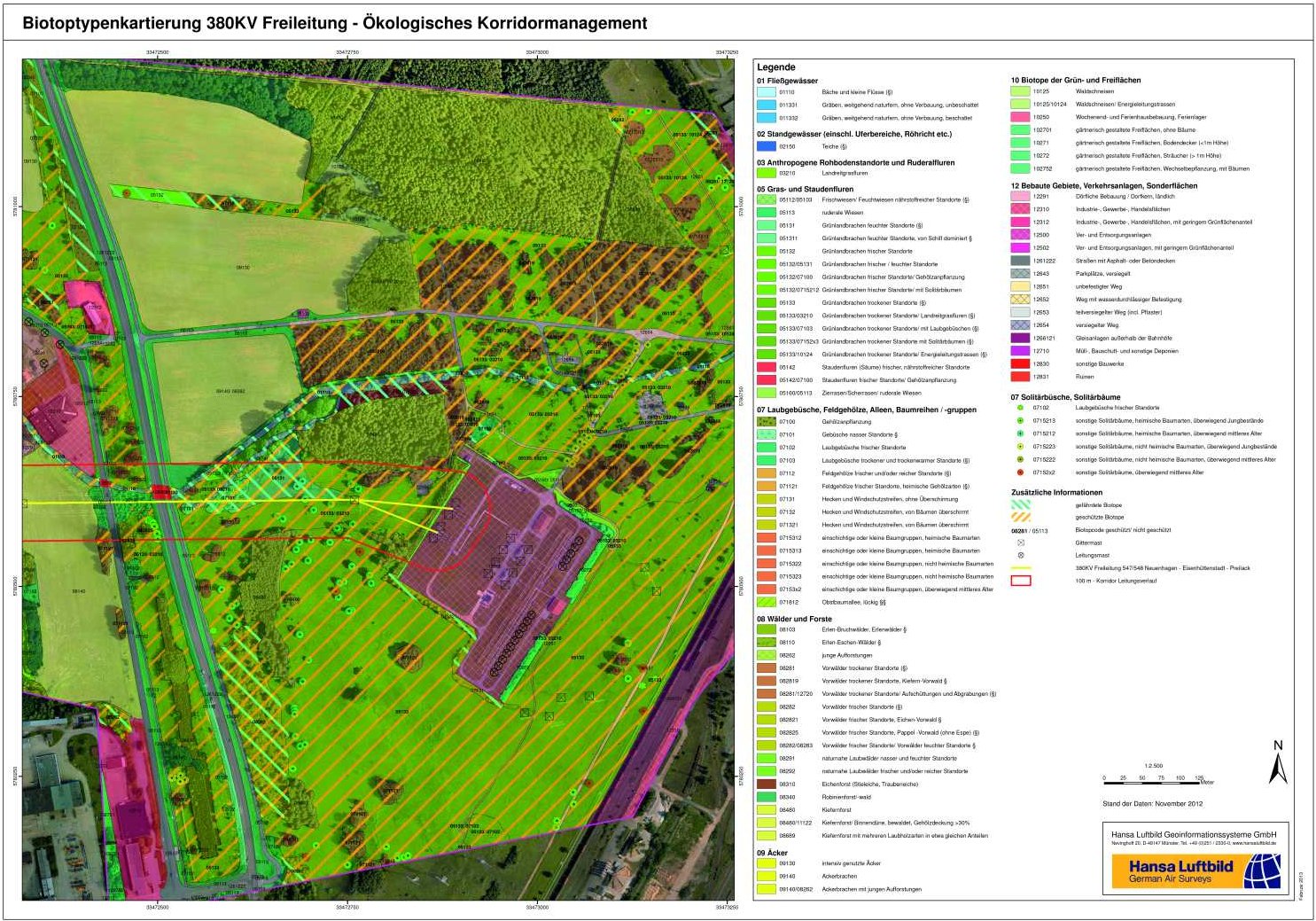 - Luftbildgestütze, flächendeckende Biotoptypenkartierung mit Erfassung geschützter Biotope und Darstellung von Gefährdungs- und Entwicklungspotenzialen entlang Ihrer Trasse